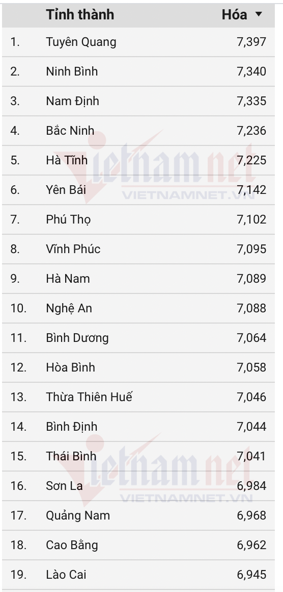 9 địa phương khác nằm trong top 10 địa phương có điểm trung bình Hóa học cao nhất gồm Bình dương, Phú Thọ, Hà Nam, Tuyên Quang, Ninh Bình, Thưa Thiên Huế, Hà Tĩnh, Vĩnh Phúc, Hưng Yên.