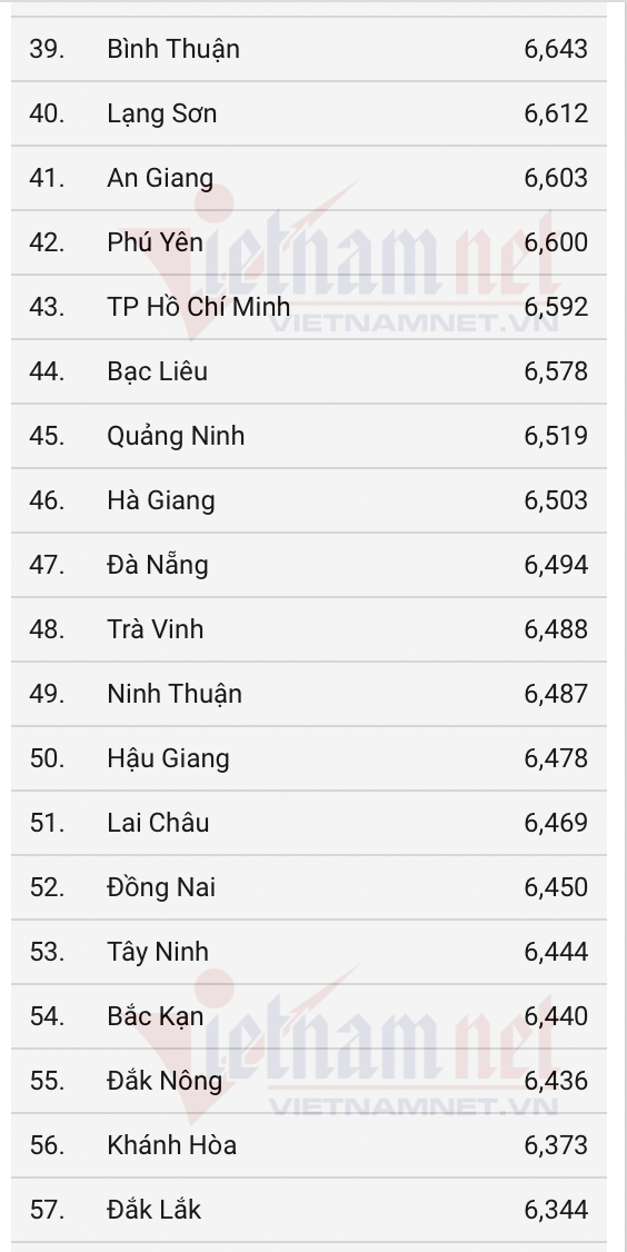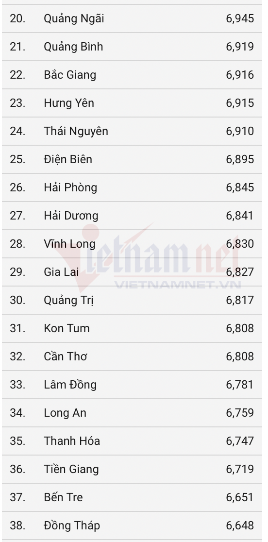 Các địa phương còn lại trong top 10 còn: Bắc Ninh, Hà Tĩnh, Yên Bái, Phú Thọ, Vĩnh Phúc, Hà Nam, Nghệ An.