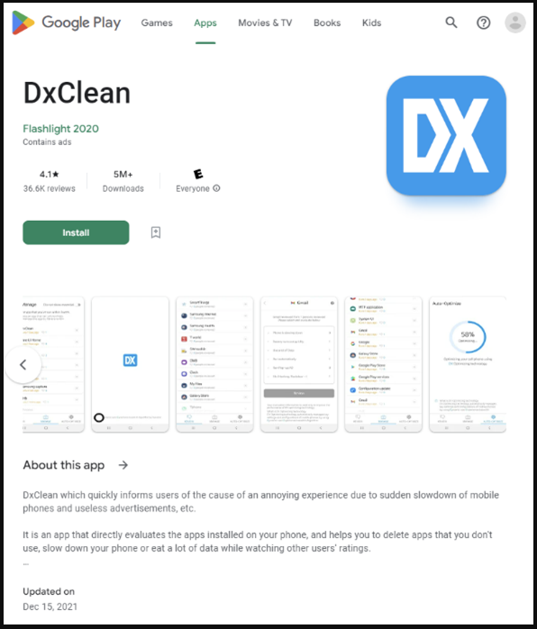 Tất cả 16 ứng dụng đều đã bị gỡ khỏi Google Play sau khi McAfee báo cáo cho Google. Tuy nhiên, trước khi bị xóa, chúng được tải 20 triệu lượt. Trong số này, DxClean được tải về 5 triệu lượt và được đánh giá lên tới 4,1/5 sao. DxClean ngụy trang dưới vỏ bọc ứng dụng dọn dẹp và tối ưu hóa hệ thống, hứa hẹn phát hiện nguyên nhân làm chậm thế thống và ngăn chặn các quảng cáo phiền toái. Dù vậy, mục đích sử dụng thực tế của nó lại hoàn toàn trái ngược.