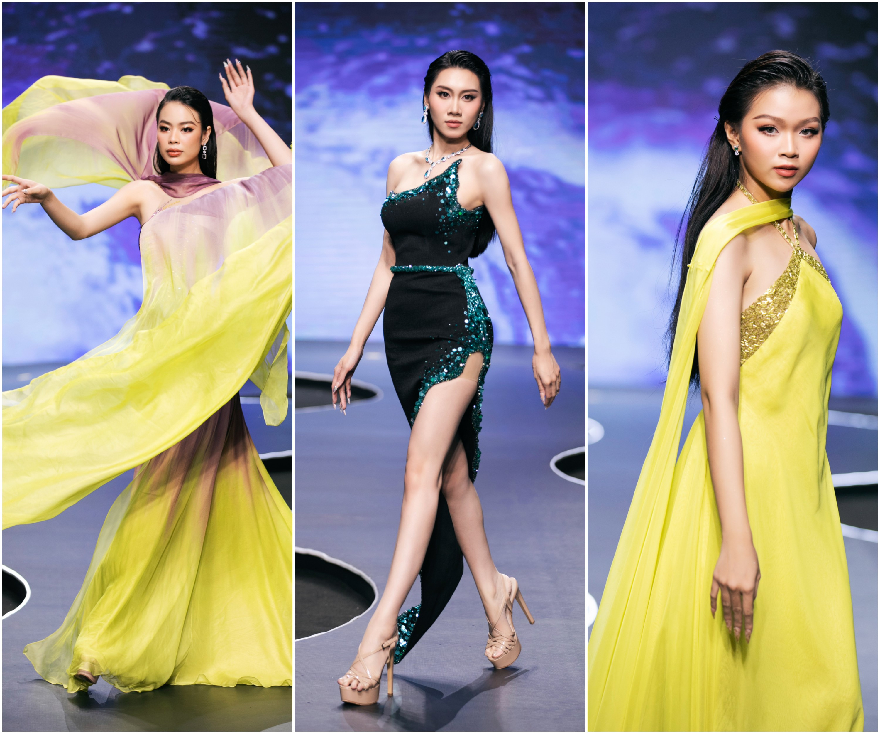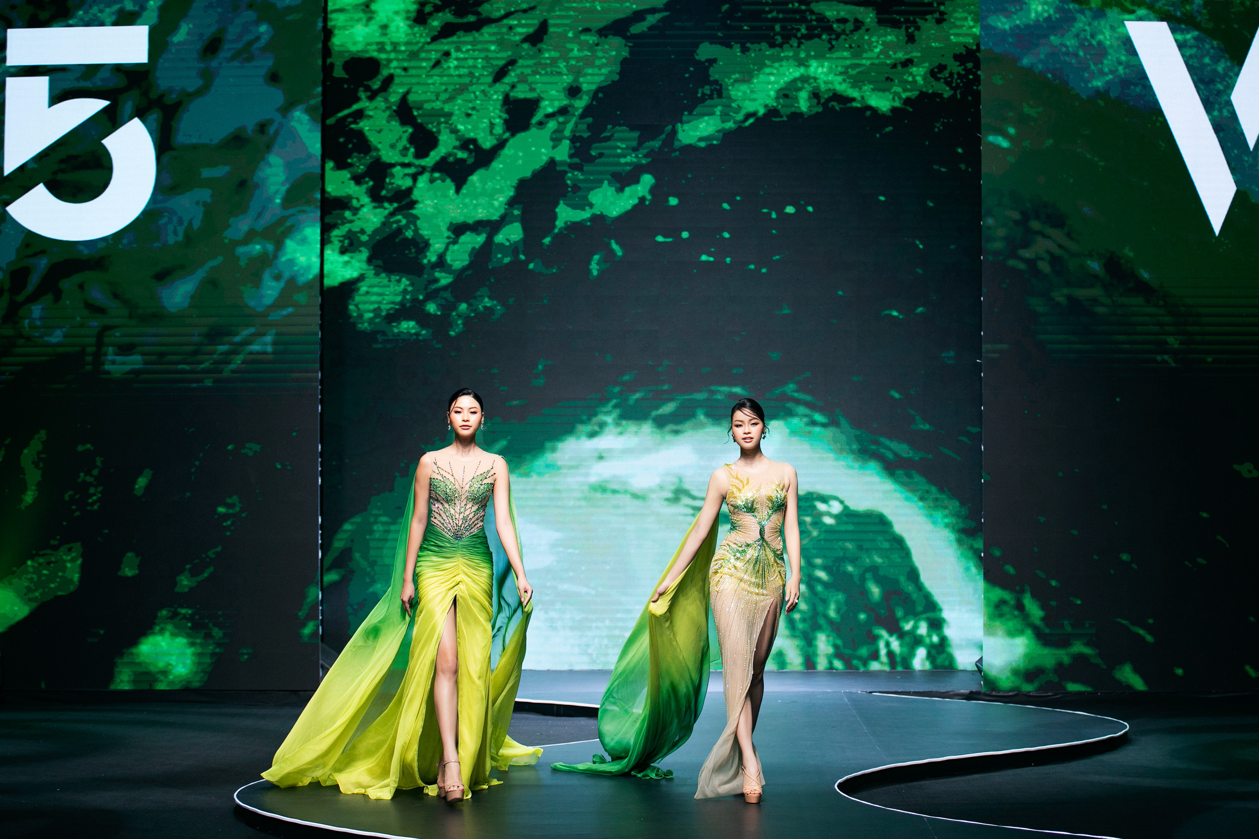 BST “Catchy - Sự lôi cuốn ngọt ngào” được mở màn ấn tượng với sự xuất hiện của Á hậu 1 Miss World Vietnam 2023 - Đào Thị Hiền cùng chị gái Đào Thị Hà. Cả hai cùng diện những thiết kế tà bay xanh lá lộng lẫy; đây đồng thời là tone màu chủ đạo của mùa Miss Grand Vietnam năm nay.
