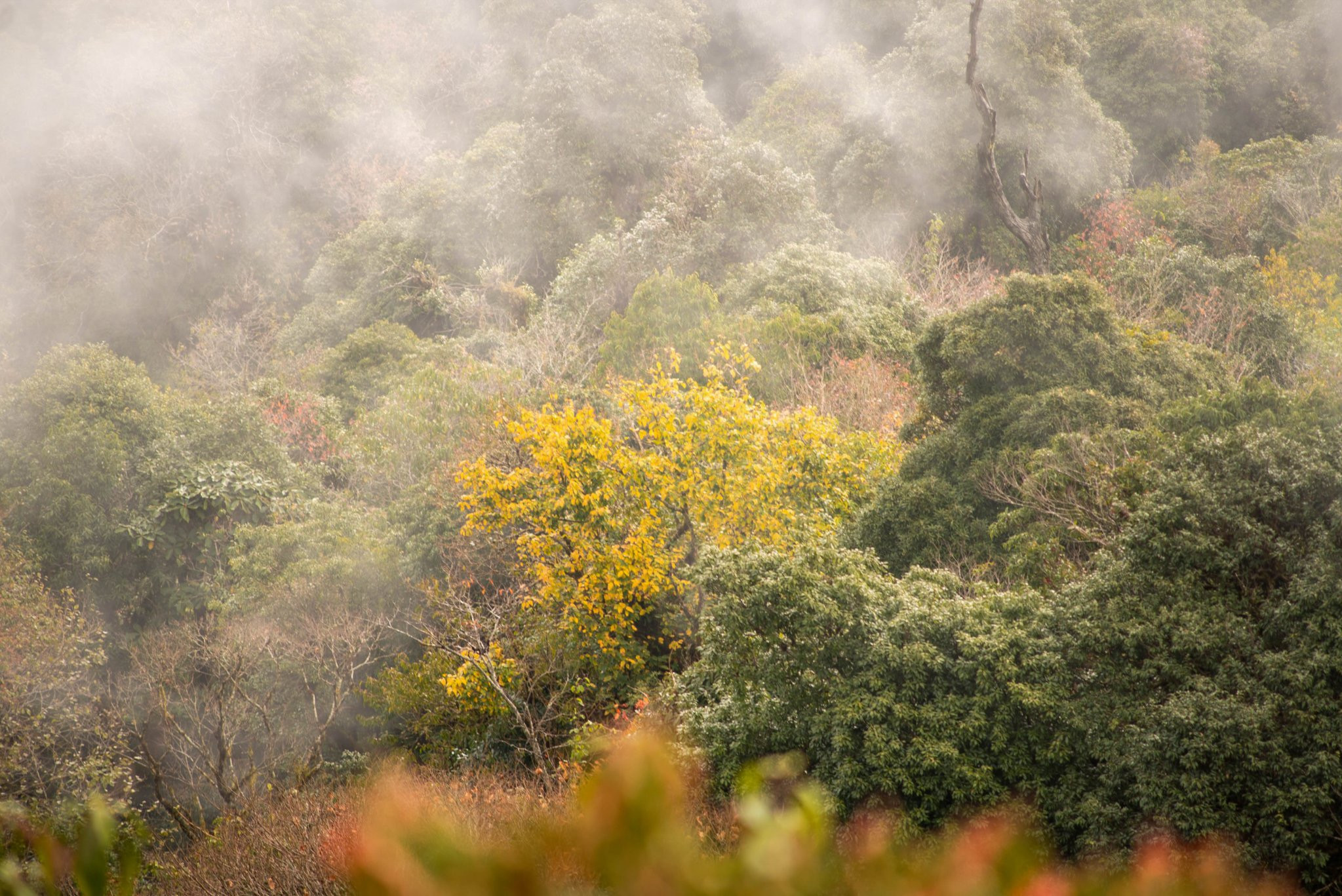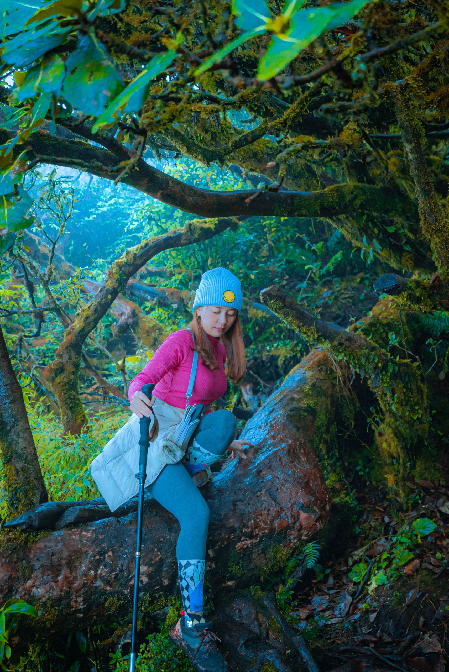 Thời tiết không thuận lợi nhưng chị Dương vẫn bị thu hút bởi thảm thực vật phong phú của khu rừng. Dưới chân núi là tầng sinh trưởng của cây bụi, thảm cỏ, mọc xen lẫn những vách đá. Lên cao hơn là rừng thảo quả tỏa hương thơm một vùng, rừng trúc cả nghìn cây mọc chen chúc xung quanh những dòng suối cạn.