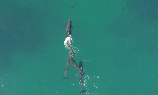 Đoạn clip do máy bay không người lái quay được cho thấy, một tốp gồm 4 con cá giả hổ kình (false killer whale), một loài cá voi thuộc họ cá heo đại dương, đang hợp sức vây bắt một con cá mập chưa trưởng thành gần Cronulla, Sydney.