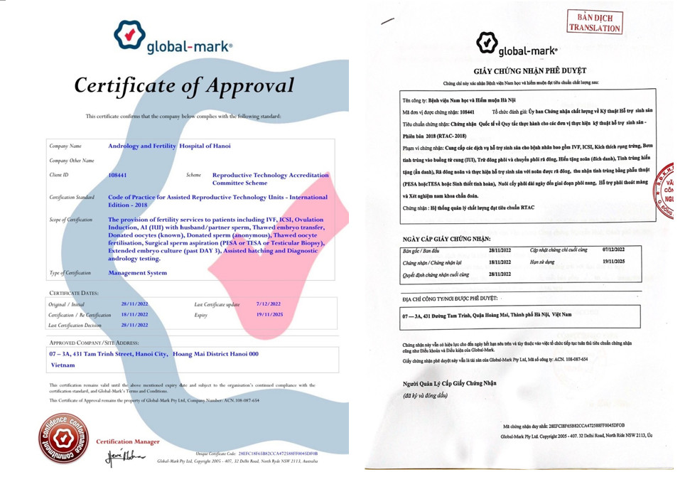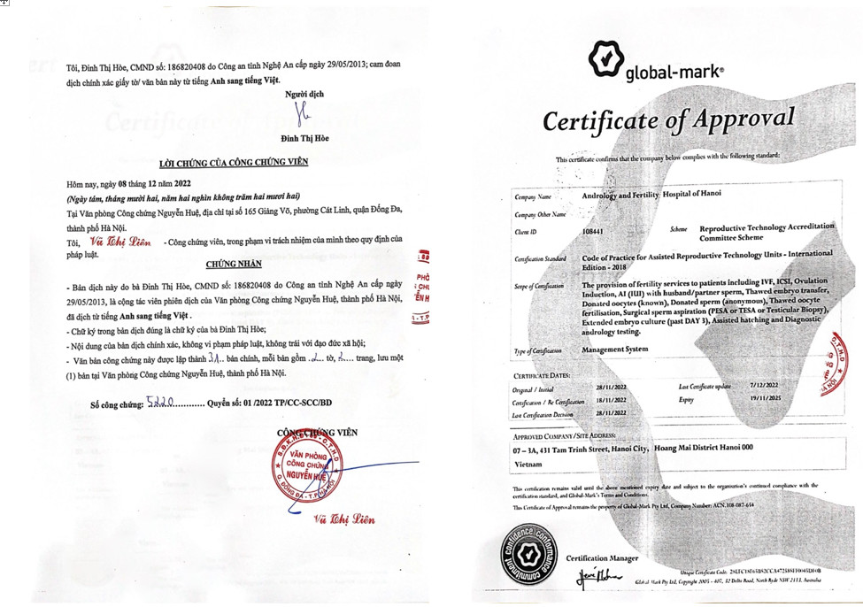 Sau thời gian thẩm định, Bệnh viện Nam học và Hiếm muộn Hà Nội đã được Đại diện Ủy ban Chứng nhận chất lượng về Kỹ thuật sinh sản thuộc Hiệp hội Sinh sản Úc đánh giá là đơn vị có quy trình quản trị chất lượng đồng bộ, khép kín từ khâu tiếp đón, thăm khám, tư vấn cho đến khi thực hiện hỗ trợ sinh sản cũng như theo dõi thai kì sau đó. Trong suốt quá trình điều trị tại bệnh viện, mọi ý kiến, góp ý của bệnh nhân đều được phản hồi một cách nhanh chóng, tích cực thông qua các kênh hỗ trợ trực tiếp và gián tiếp.