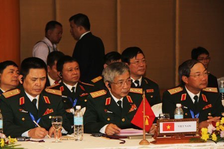 Thứ trưởng Quốc phòng Nguyễn Chí Vịnh tranh luận về những vấn đề liên quan Biển Đông tại phiên họp trao đổi về an ninh khu vực của hội nghị Quan chức quốc phòng cao cấp ASEAN mở rộng (ADSOM+) tại Campuchia ngày 26/4.