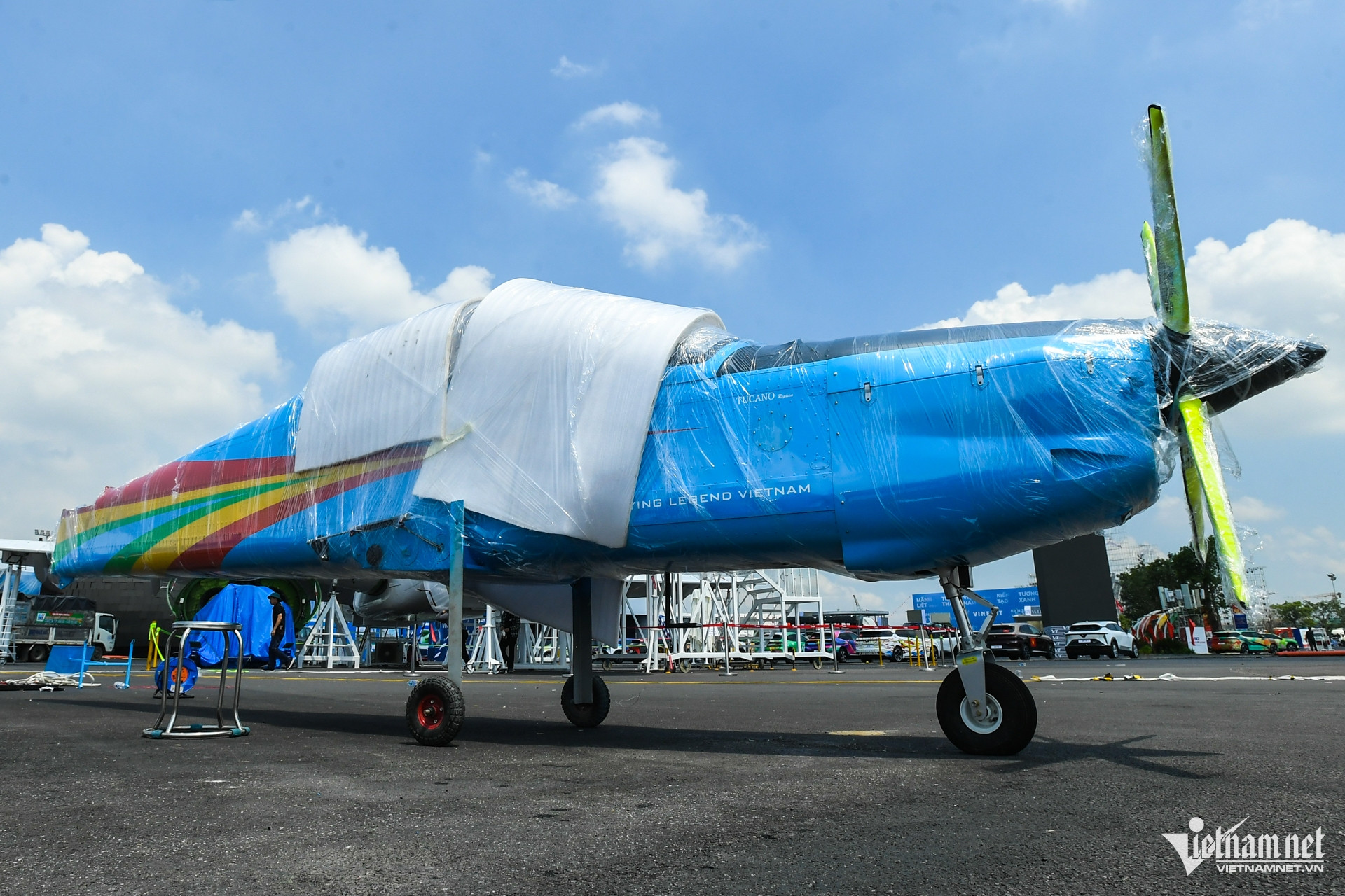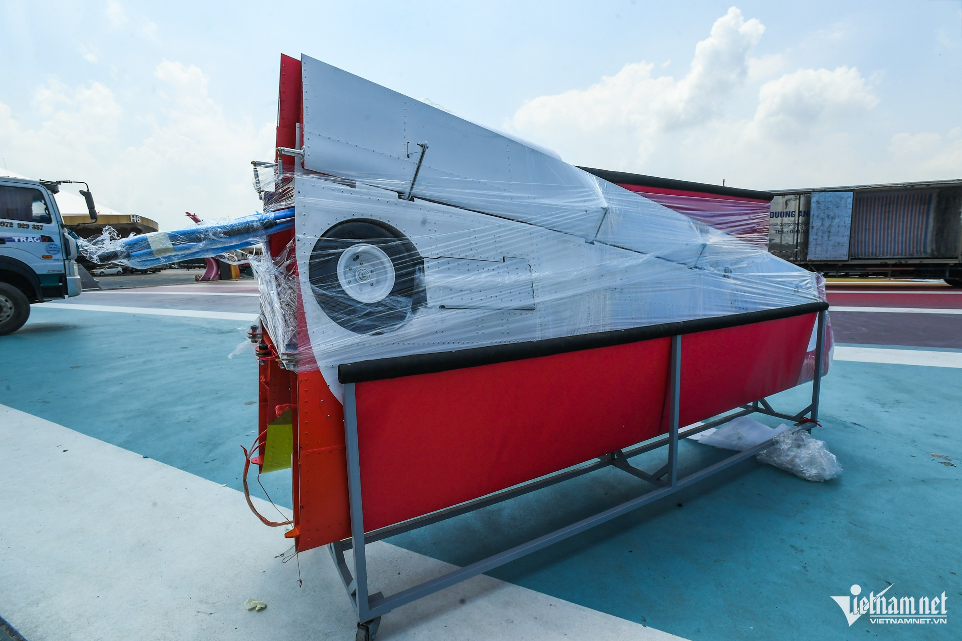 Trong khi đó, hai máy bay Tucano Replica đã được tháo rời hai cánh, bọc kín cẩn thận chờ vận chuyển. Đây là dòng máy bay do hãng Flying Legend (Italy) sản xuất là dòng thể thao siêu nhẹ hai chỗ ngồi bằng hợp kim nhôm.
