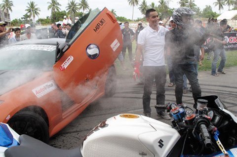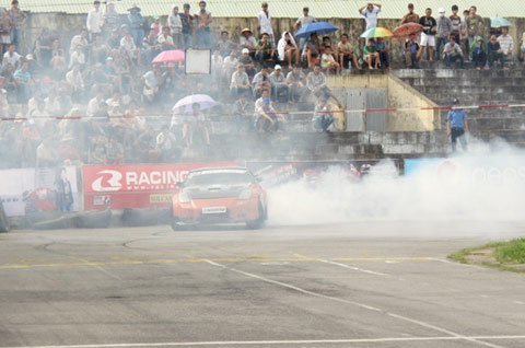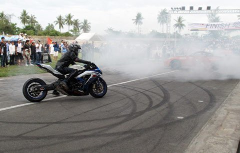 Hai chiếc xe thể thao, một chiếc bốn bánh và một chiếc hai bánh cùng đọ sức mạnh bằng màn diễn đốt lốp và drift đẹp mắt dưới sự điều khiển của hai “tay chơi” người Việt thuộc nhóm D1 Workshop.
