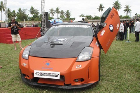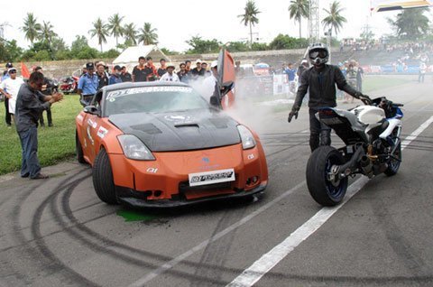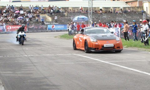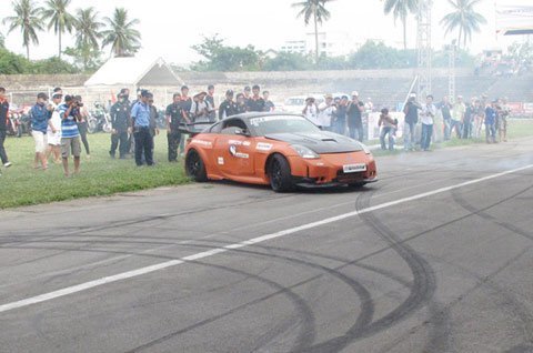 Dưới bàn tay của người Việt, mẫu thể thao Nissan 350z trong bộ cánh mầu cam đã được độ gầm và công suất cùng chiếc Suzuki GSX độ kéo dài càng vừa so tài bằng màn diễn nghệ thuật trên sân vận động Quân khu 5 (Đà Nẵng) hôm 24/6.