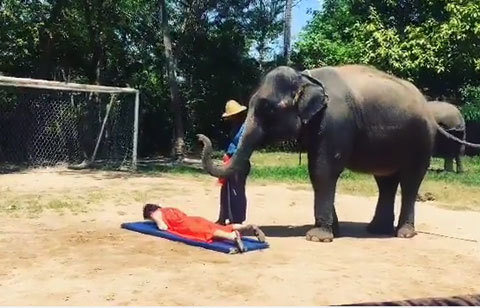 Trên Instagram, ca sĩ Tóc Tiên vui vẻ chia sẻ đoạn clip mình nằm dưới đất và vô tư để cho vòi voi đập mạnh vào lưng mình dưới sự cổ vũ của nhiều người. Cô còn đăng một status khác vui vẻ: "Và cô ấy tự biến mình thành trò hề mua vui cho thiên hạ như thế đó. Voi ơi là voi".