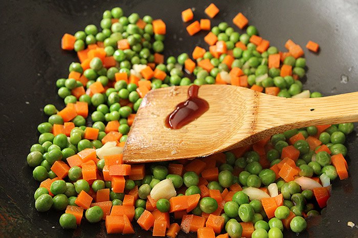 Vẫn trong chảo đó, cho đậu Hà Lan và cà rốt vào, đảo đều, nêm muối và dầu hào vừa ăn, xào chín.