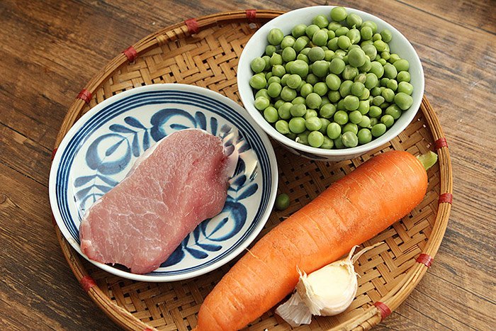 - 1 bát con hạt đậu Hà Lan, 150g thịt lợn ngon, 1 củ cà rốt nhỏ, 2 nhánh tỏi, 1 thìa nước tương, 1 thìa hắc xì dầu, 1 thìa dầu hào, 1 thìa muối, 1 thìa cà phê tinh bột ngô hòa với 1 thìa cà phê nước thành nước tinh bột