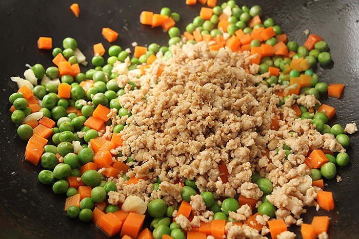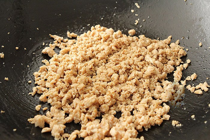 Đổ dầu ăn vào nồi, đun nóng dầu ăn rồi cho gừng và tỏi vào xào cho thơm. Sau đó, cho thịt băm đã chuẩn bị vào xào cùng, xào cho đến khi thịt chuyển sang màu nhạt, tắt bếp, cho thịt ra đĩa để riêng.