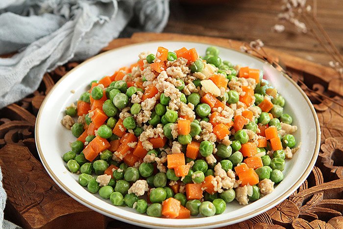 Cho nước vào nồi, thêm một thìa muối và vài giọt dầu vào đun sôi (để đậu Hà Lan giữ được màu xanh), cho hạt đậu vào luộc chín. Cho cà rốt vào nồi đun sôi khoảng 2-4 phút là được, chắt nước và để riêng.