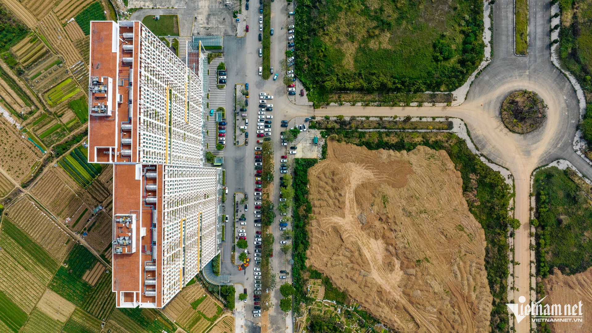 Tuyến đường xuyên qua phía trước một tòa nhà chung cư, có bãi đỗ xe hai bên.