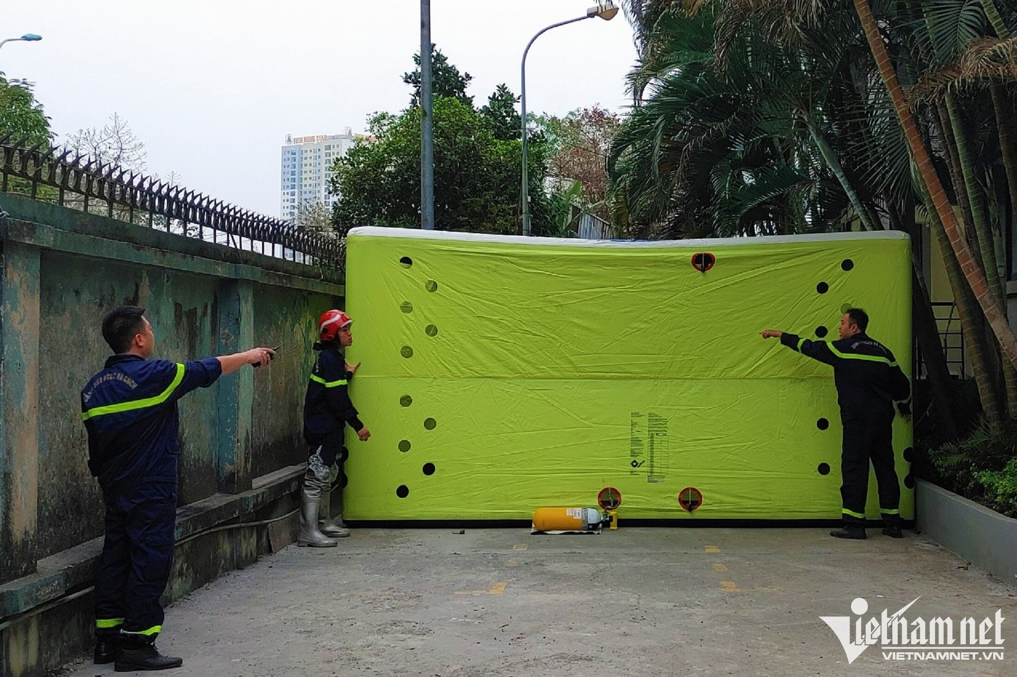 Tại hiện trường, lực lượng cứu nạn cứu hộ đã triển khai bơm đệm hơi dưới sân chung cư và cử cán bộ, chiến sĩ phối hợp với lực lượng Công an phường sở tại để thuyết phục, động viên nạn nhân.
