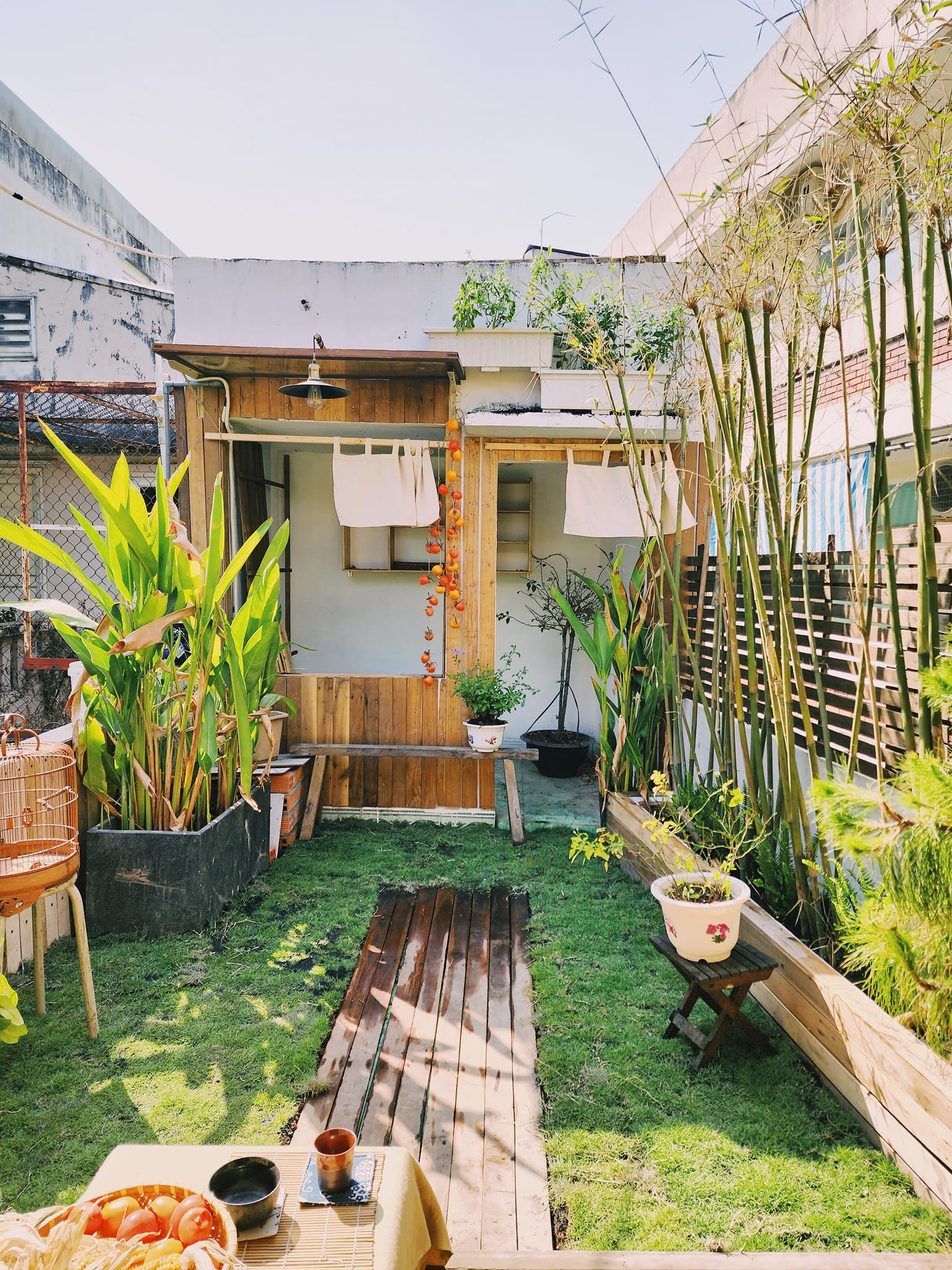 Do nằm trên sân thượng, vấn đề thời tiết sẽ ảnh hưởng đến độ bền của vật liệu gỗ, vì vậy những kết cấu chính anh chọn gỗ dầu – loại vật liệu thích ứng được với khí hậu mưa, nắng. Những khu vực khác anh dùng gỗ pallet đóng và muốn để nguyên sự mộc mạc, sờn cũ, để gỗ lên rêu một chút cho xưa cũ.