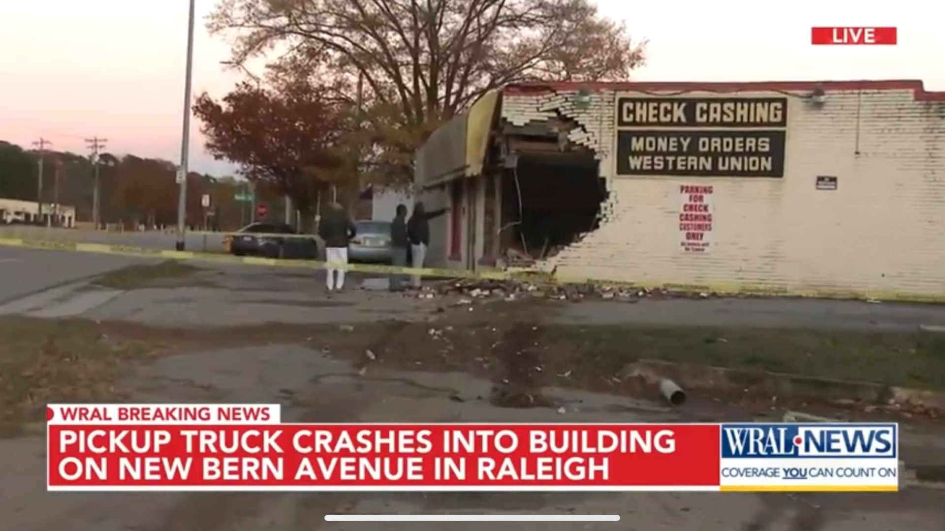 Theo trang tin WRAL của tiểu bang Bắc Carolina đăng tải, tài xế cầm lái chiếc Ford Mustang mui trần cho rằng họ bị một chiếc xe khác tông vào và đẩy xe của họ lao vào cửa tiệm.
