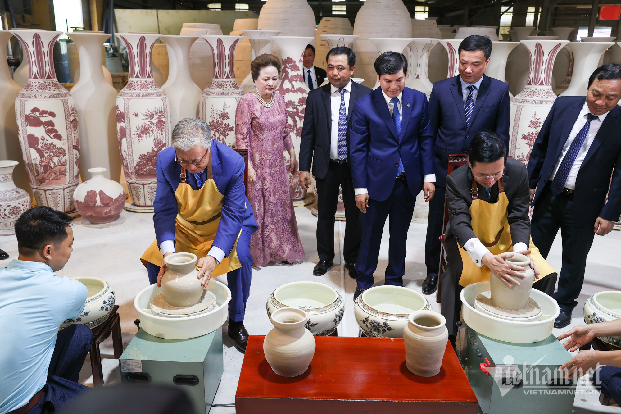 Sau khi tham quan khu trưng bày, Chủ tịch nước và Tổng thống Kazakhstan đã trực tiếp thử tài làm Gốm Chu Đậu ở khâu tạo hình hai chiếc bình gốm trên bàn xoay.
