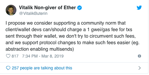 "Tôi đề nghị chúng ta xem xét hỗ trợ một quy tắc cộng đồng rằng các nhà phát triển các ví nên tính phí 1 gas cho các giao dịch được gửi qua ví của họ. Chúng ta không cố gắng tránh các khoản phí đó và chúng ta hỗ trợ thay đổi giao thức để thực hiện các khoản phí đó dễ dàng hơn", Vitalik cho biết.