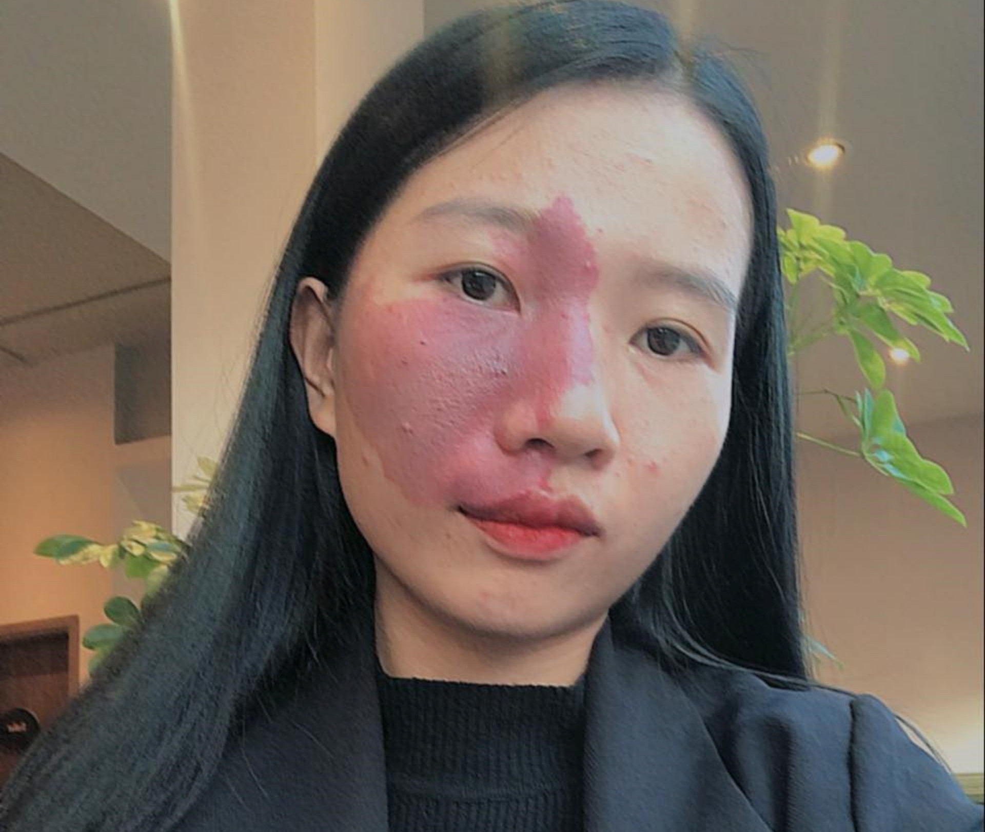 Vết bớt màu đỏ chiếm gần hết phần mặt bên trái, có từ lúc Ngân vừa chào đời. Theo thời gian, vết bớt không lan rộng nhưng sẫm màu hơn.