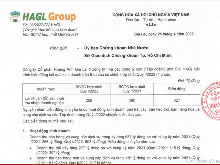 Báo cáo tài chính quý I/2022 của HAG ghi nhận doanh thu thuần đạt 803 tỷ đồng, tăng gấp 3 lần so với cùng kỳ năm trước. Nhờ cân đối chi phí cũng như cải thiện hợp lý trong kinh doanh nên quý đầu năm 2022, HAG đạt lợi nhuận 258 tỷ đồng, tăng mạnh so với mức lỗ 69 tỷ đồng cùng kỳ. Kết quả này do hoạt động kinh doanh bán trái cây, bán heo thịt và bán hàng hóa, dịch vụ chuyển biến tích cực.