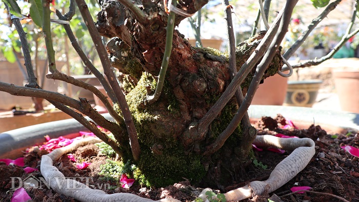 Ghi nhận của phóng viên Báo điện tử DANVIET.VN tại vườn của anh Minh, gốc của cây hoa hồng có chu vi là 60cm, một con số mà người chơi hoa hồng cổ rất mong ước sở hữu.