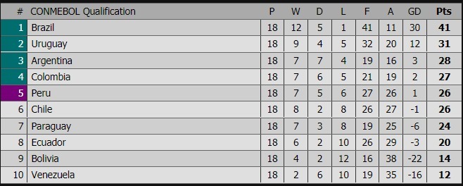 Suất đá play-off đã thuộc về Peru khi xếp thứ 5 với 26 điểm bằng với Chile nhưng hơn nhà ĐKVĐ Nam Mỹ về chỉ số phụ.
