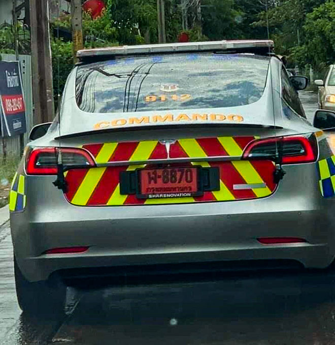 Một bức ảnh về dàn xe cảnh sát mới nhất tại Thái đã gây xôn xao không nhỏ trong cộng đồng mạng. Dàn xe gồm 7 chiếc Tesla Model 3 được dán decal cảnh sát Thái và lắp đèn và còi báo hiệu, sẵn sàng thực hiện nhiệm vụ. Những chiếc xe này sẽ được chuyển đến trụ sở ở Dusit (Bangkok).