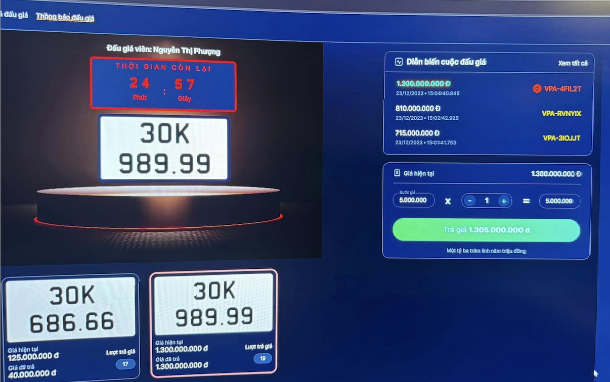 Ngoài biển số siêu VIP trên, phiên đấu giá sáng nay có một số biển trúng giá cao khác như: Biển đuôi tứ quý 9 của TP HCM 51L - 099.99 chốt giá 1,37 tỷ đồng; biển có dãy số "lộc phát" 88A - 686.68 của Vĩnh Phúc giá 900 triệu đồng; biển 30K - 998.99 của TP Hà Nội giá 890 triệu đồng; biển 51L - 277.77 của TP HCM giá 440 triệu đồng...