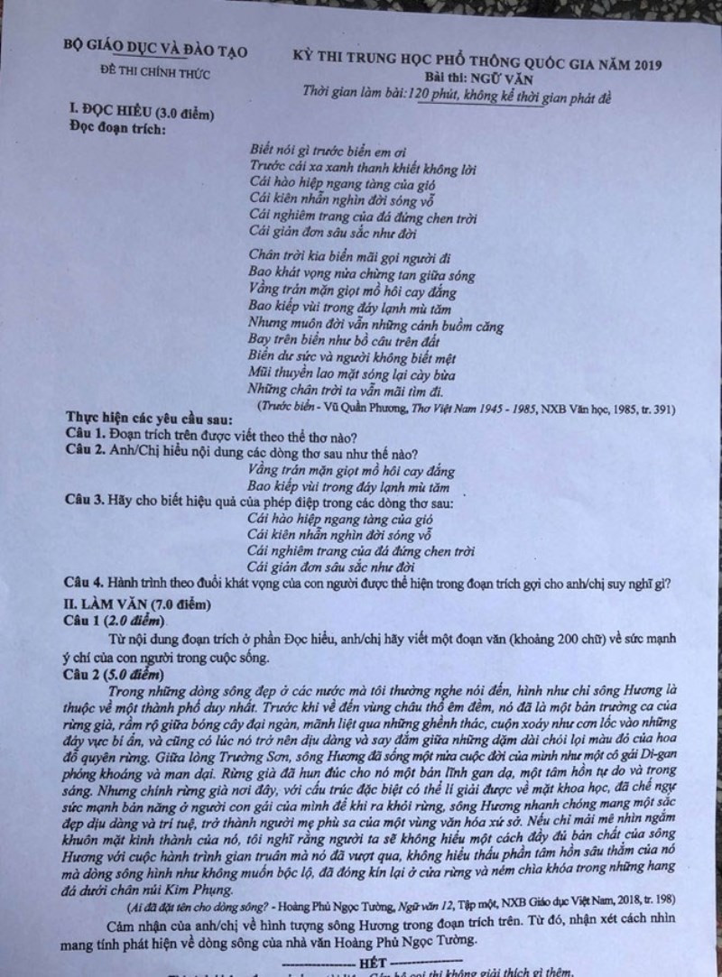 Năm 2019, kỳ thi vẫn mang tên Kỳ thi THPT quốc gia. Đối với đề Ngữ văn, phần Đọc hiểu ra tác phẩm Trước biển của Vũ Quần Phương. Phần Làm văn ra tác phẩm Ai đã đặt tên cho dòng sông của Hoàng Phủ Ngọc Tường.