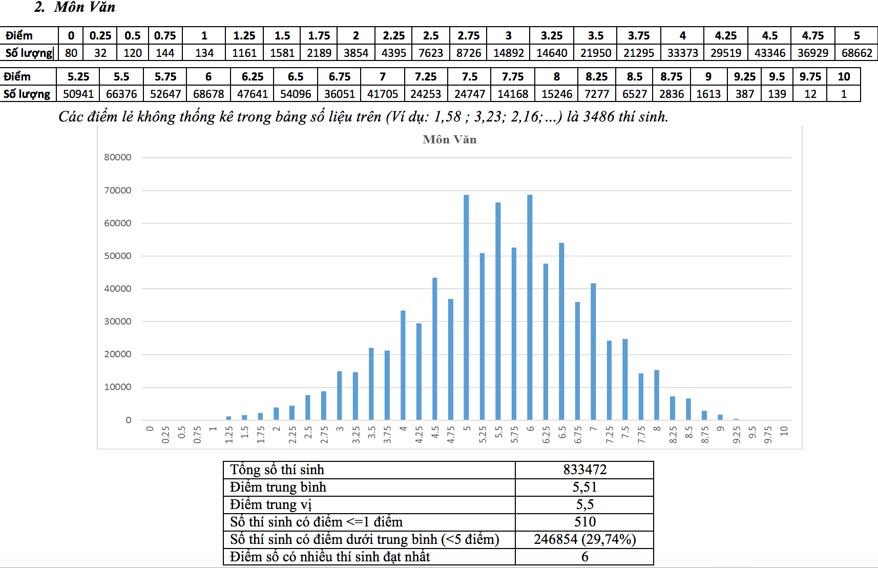Kết quả phân tích phổ điểm thi tốt nghiệp THPT môn Ngữ văn của cả nước năm 2021 cho thấy: Có 978.027 thí sinh tham gia thi bài thi Ngữ văn trong đó điểm trung bình là 6,47 điểm, điểm trung vị là 6,5 điểm; điểm số có nhiều thí sinh đạt nhất là 7 điểm. Số thí sinh có điểm <= 1 là 172 (chiếm tỷ lệ 0.02%); số thí sinh đạt điểm dưới trung bình là 117.915 (chiếm tỷ lệ 12,06%).