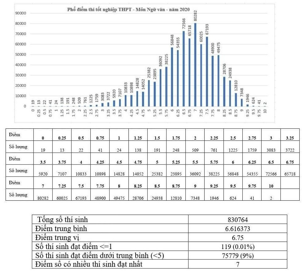 Năm 2020, điểm trung bình bài thi môn Ngữ văn là 6,62. Điểm số có nhiều thí sinh đạt được nhất là 7 điểm. Số thí sinh đạt điểm dưới trung bình là 75.779 (chiếm tỷ lệ 9%). Có 2 thí sinh đạt điểm 10 trong bài thi môn Ngữ văn của kỳ thi tốt nghiệp THPT năm 2020.
