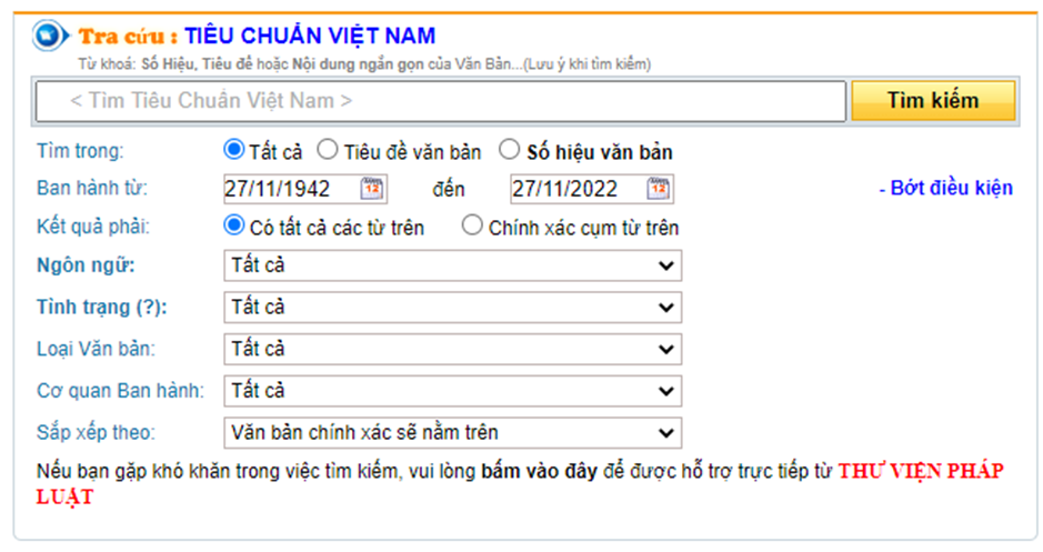 Để việc tra cứu tiêu chuẩn Việt Nam được tối ưu, người dùng có thể chọn thêm/bớt các điều kiện như ngày ban hành, ngôn ngữ, tình trạng hiệu lực, cơ quan ban hành,… để cho ra kết quả tìm kiếm tốt nhất.