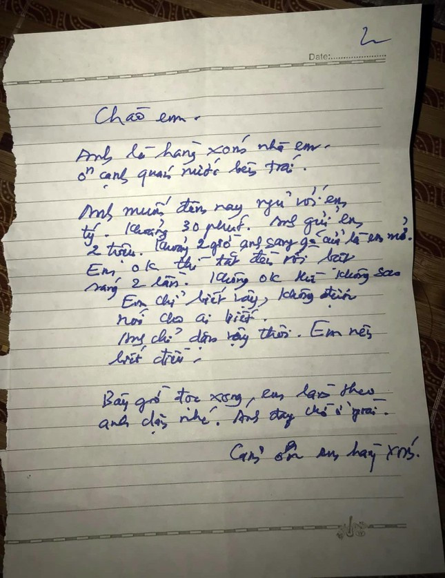 Nội dung bức thư viết “Chào em, anh là hàng xóm nhà em ở cạnh quán nước bên trái. Anh muốn đêm nay ngủ với em tý. Khoảng 30 phút. Anh gửi em 2 triệu. Khoảng 2h anh sang gõ cửa là em mở, em đồng ý thì tắt đèn bật sáng 2 lần, không đồng ý thì không sao. Em chỉ biết vậy, không được nói cho ai biết…Bây giờ đọc xong, em làm theo anh dặn nhé. Anh đang chờ ở ngoài…”.