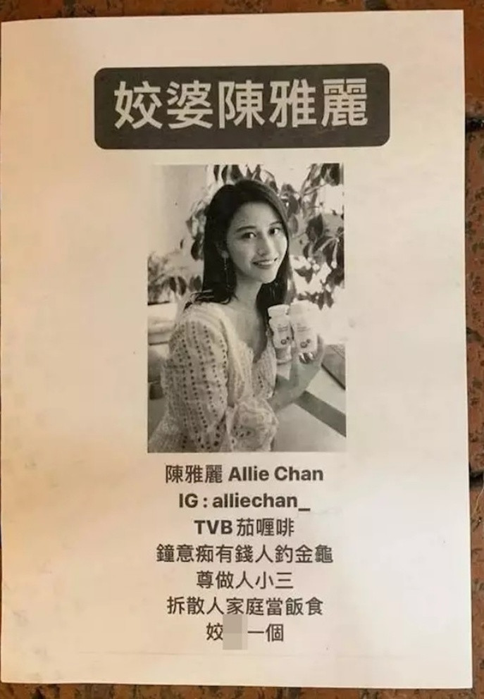Tối 3/11, tờ rơi in ảnh Trần Nhã Lệ được rải khắp nơi ở đường phố Hong Kong với nội dung: "Trần Nhã Lệ - diễn viên TVB thích tìm đại gia để quen, chuyên làm kẻ thứ ba, quen thói phá hoại hạnh phúc gia đình người khác".