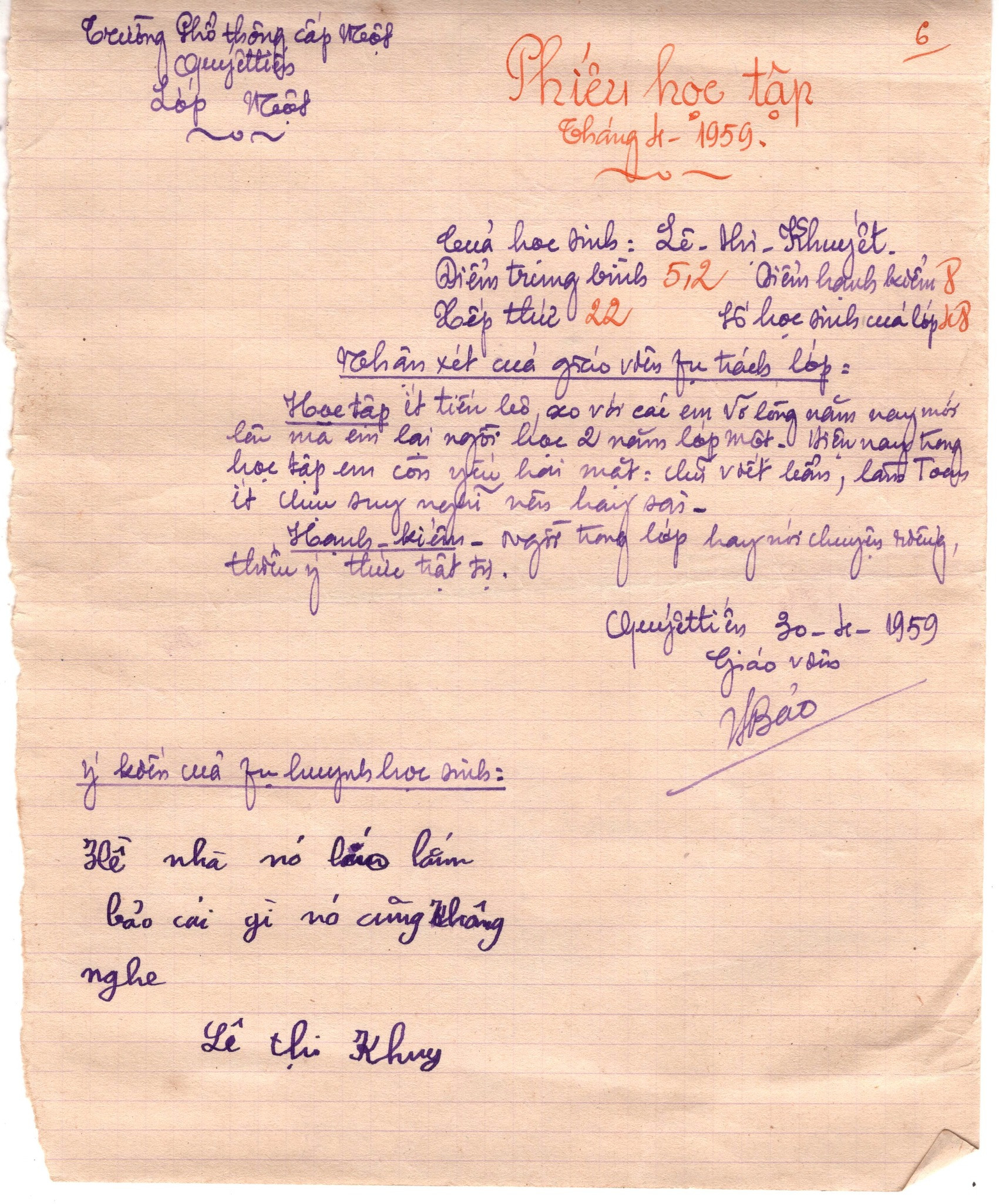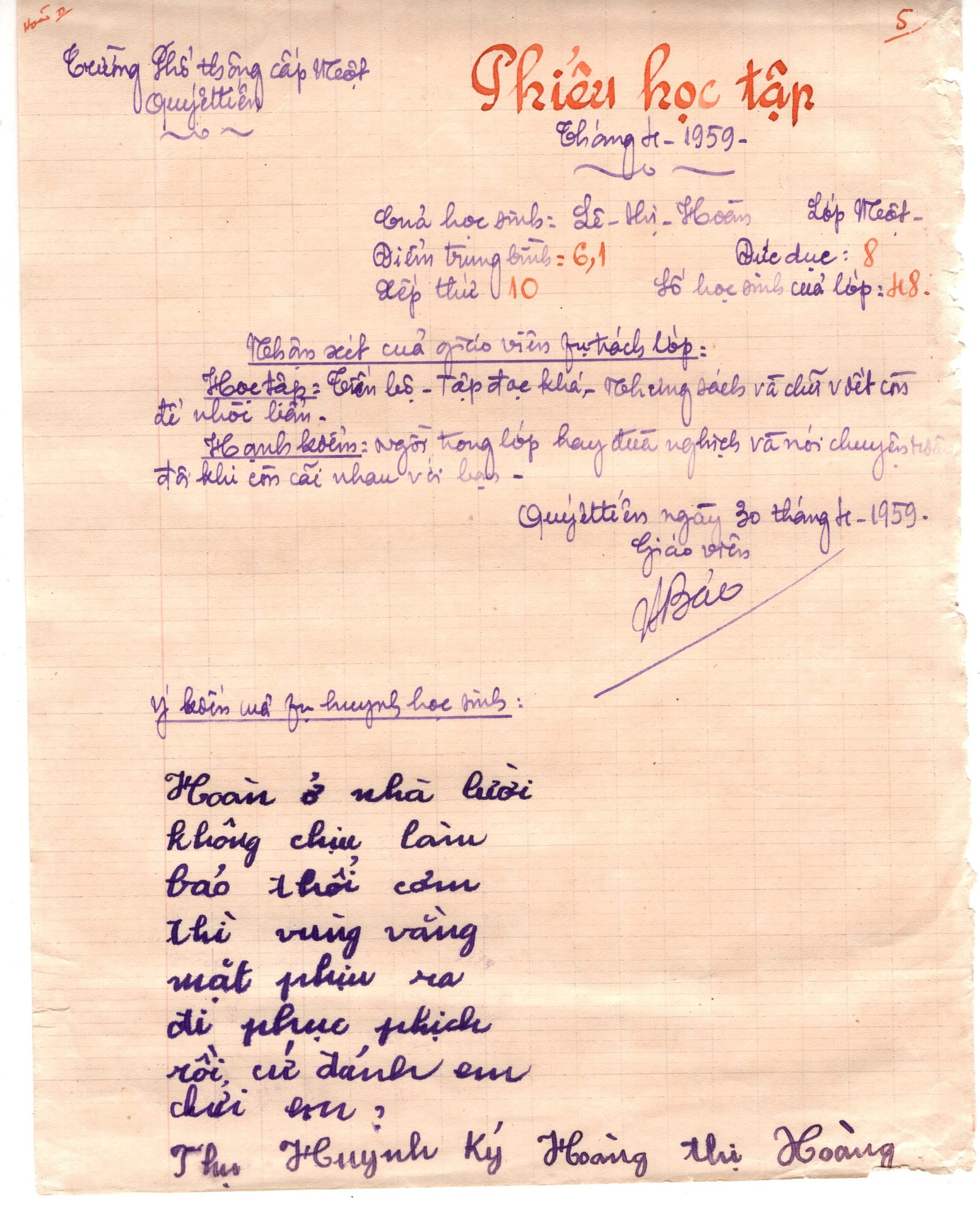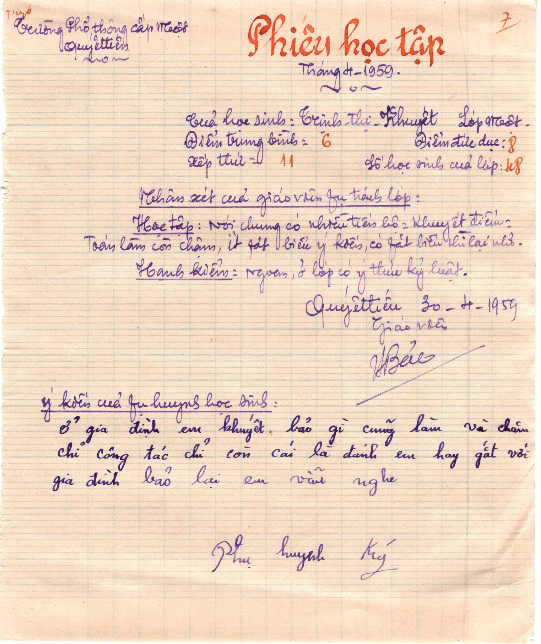 Trong những phiếu này, giáo viên ghi điểm trung bình, điểm đức dục, xếp thứ và nhận xét cụ thể từng em.