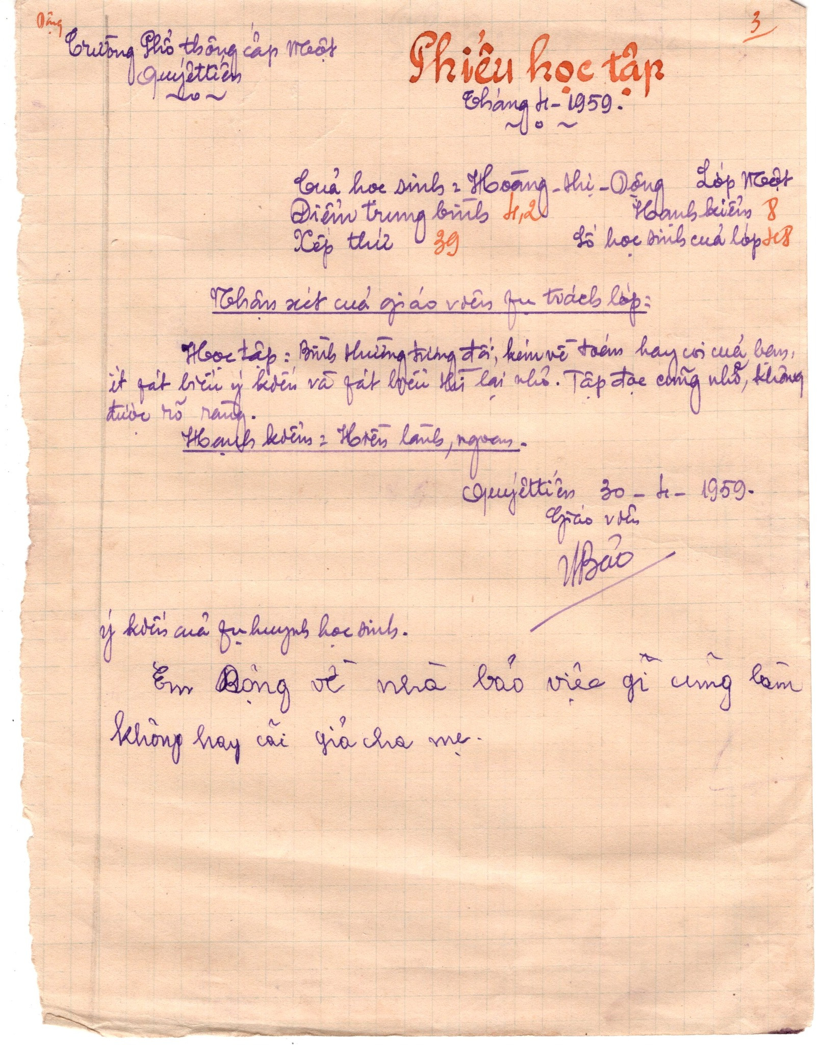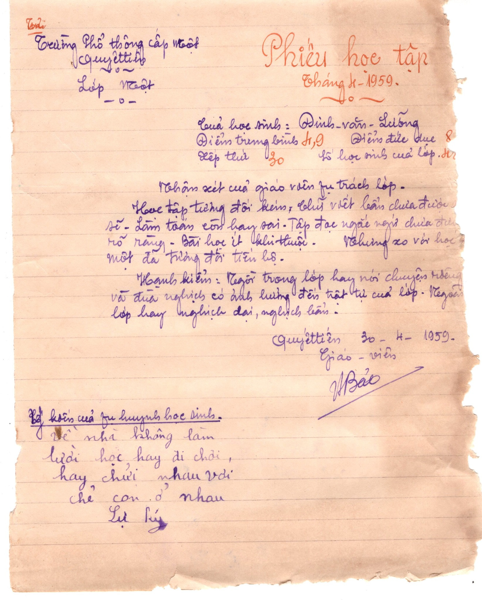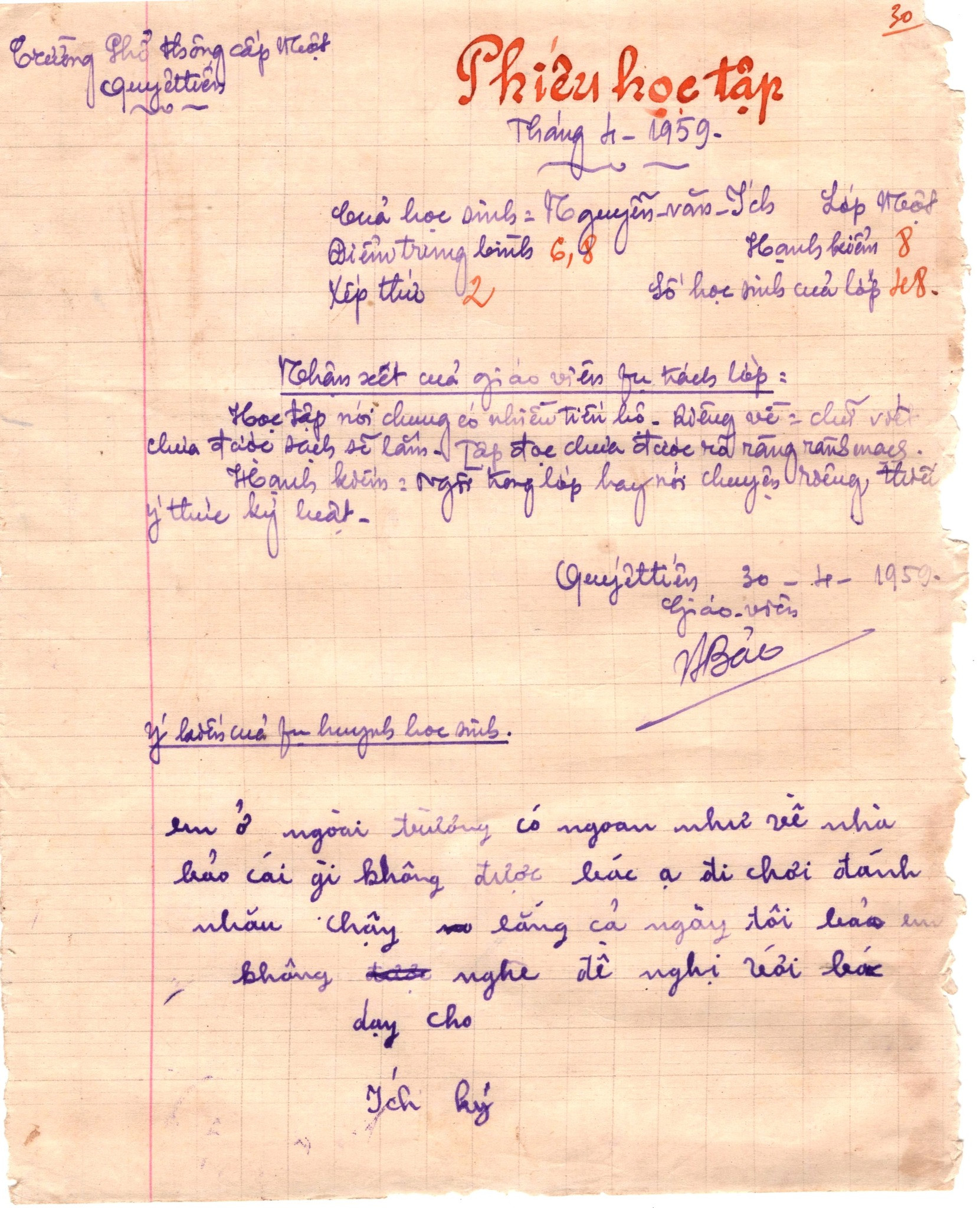 Mới đây, anh Nguyễn Đương - người sáng lập trang web mang tên Thương mái trường xưa, chuyên sưu tầm các trang sách giáo khoa, tư liệu, những đồ dùng học sinh xưa, để tìm hiểu về nền giáo dục của cha ông, đã chia sẻ một số hình ảnh về một số Phiếu học tập tháng 4/1959 của giáo viên lớp một, Trường Phổ thông cấp một Quyết tiến.