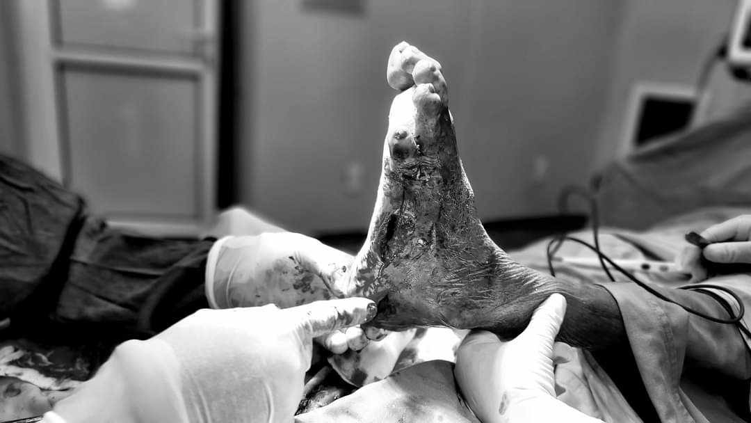 Trước đó, ông L. được người nhà đưa đến bệnh viện trong tình trạng bàn chân trái và nhiều vùng cơ thể bị nhiễm trùng, chảy dịch mủ hôi, mặt phù nề, suy gan, suy thận. Các bác sĩ Khoa Ngoại chấn thương chỉnh hình đã hội chẩn và tiến hành cắt lọc tổ chức hoại tử, điều trị tích cực, sử dụng kháng sinh liều cao...