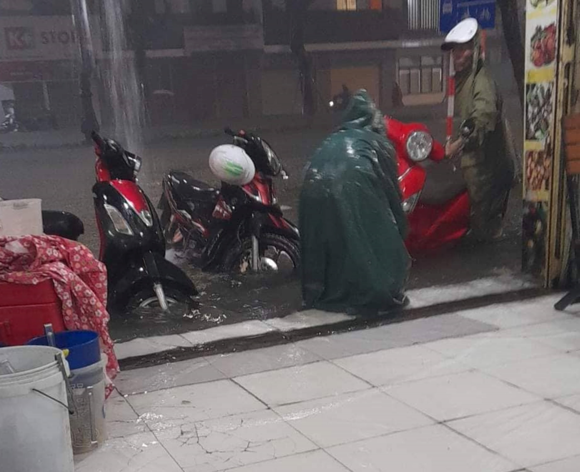 Chị quyết định nói chồng ở nhà lo cho con, còn mình sẽ tìm chỗ trú tạm. Chị được một người đàn ông và một số sinh viên hỗ trợ dắt xe vào gửi ở trụ sở công ty điện lực.