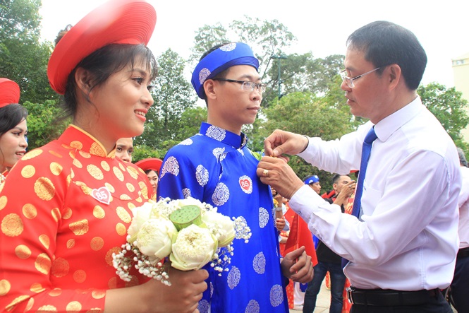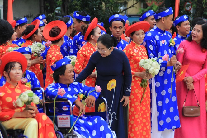 Vice Secretary of the Ho Chi Minh City Party Committee Vo Thi Dung and some other leaders of the city came to attend the event and gave presents to couples.