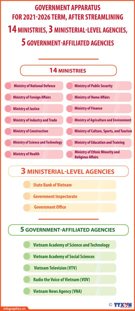 Initial outcomes show that the government apparatus for the 2021–2026 term has been significantly streamlined, now comprising 14 ministries and three ministry-level agencies, five government-affiliated bodies. The restructuring process has significantly reduced the number of administrative units and agencies to improve operational efficiency.
