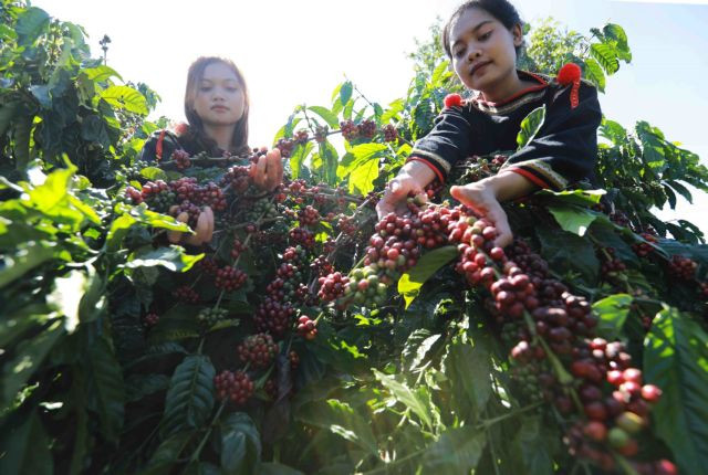 | Two ethnic women in Buôn Ma Thuột City, Đắk Lắk Province harvest coffee. — VNA/VNS Photo Vũ Sinh |
