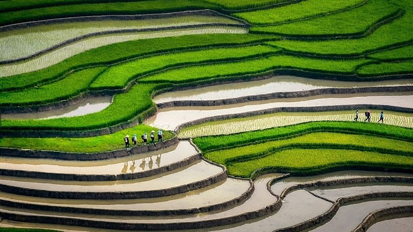 From the top of Lom Mong, looking towards Cao Pha Pass where many tourists stop, we have a new feeling about the wonderful natural picture. That wonderful picture is adorned by the water-splattering terraced fields interwoven with the young rice seedling colour created by the hands of the locals here, creating peace and prosperity in the mountainous area.