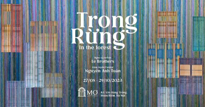 Started in 2021, In the FOREST first materialized as a series of large oil-on-canvas paintings, which then turned into painted antique door and chest frames, which were treated like painting surfaces with their corresponding three-dimensional textures and heavy materials, following by moving-image videos filmed during their Forest Trips. The large-size horizontal oil paintings have no beginning nor ending. Their surfaces are composed of crisscrossing strips of colors of different shades, from warm and brilliant to cold and dark. The paintings were created in the signature creative style of Lê Brothers: the duo took turn working on the expanses of colors to alternatively recited their emotions and awareness of the FOREST, of being in the FOREST. This recitation was presented in a continuous dialogue, a constant narration.”