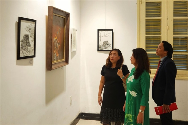 The exhibition displays 38 artworks by lecturers and students of the College of Fine Arts and the College of Science, both under Hue University. Paintings created by school students of Phong Dien District, home to Phuoc Tich Village, also are on display.
