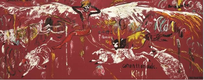 Featuring of a bold batch of primarily over-sized canvases with several of the works themselves being quadriptychs and pentaptychs. The effect of such large paintings, often done in luxuriantly thick layers of imported oils, is immediate and visceral.