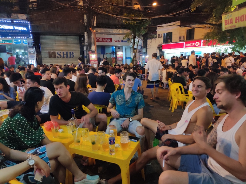 | Foreign tourists on Bia Hoi street. Photo: Kike |