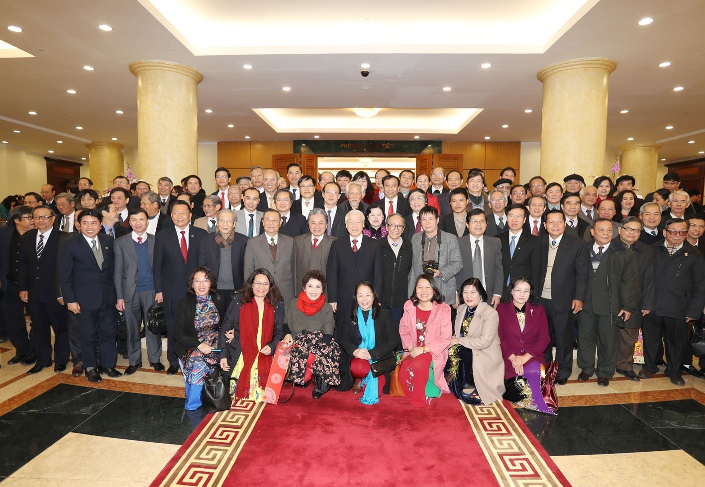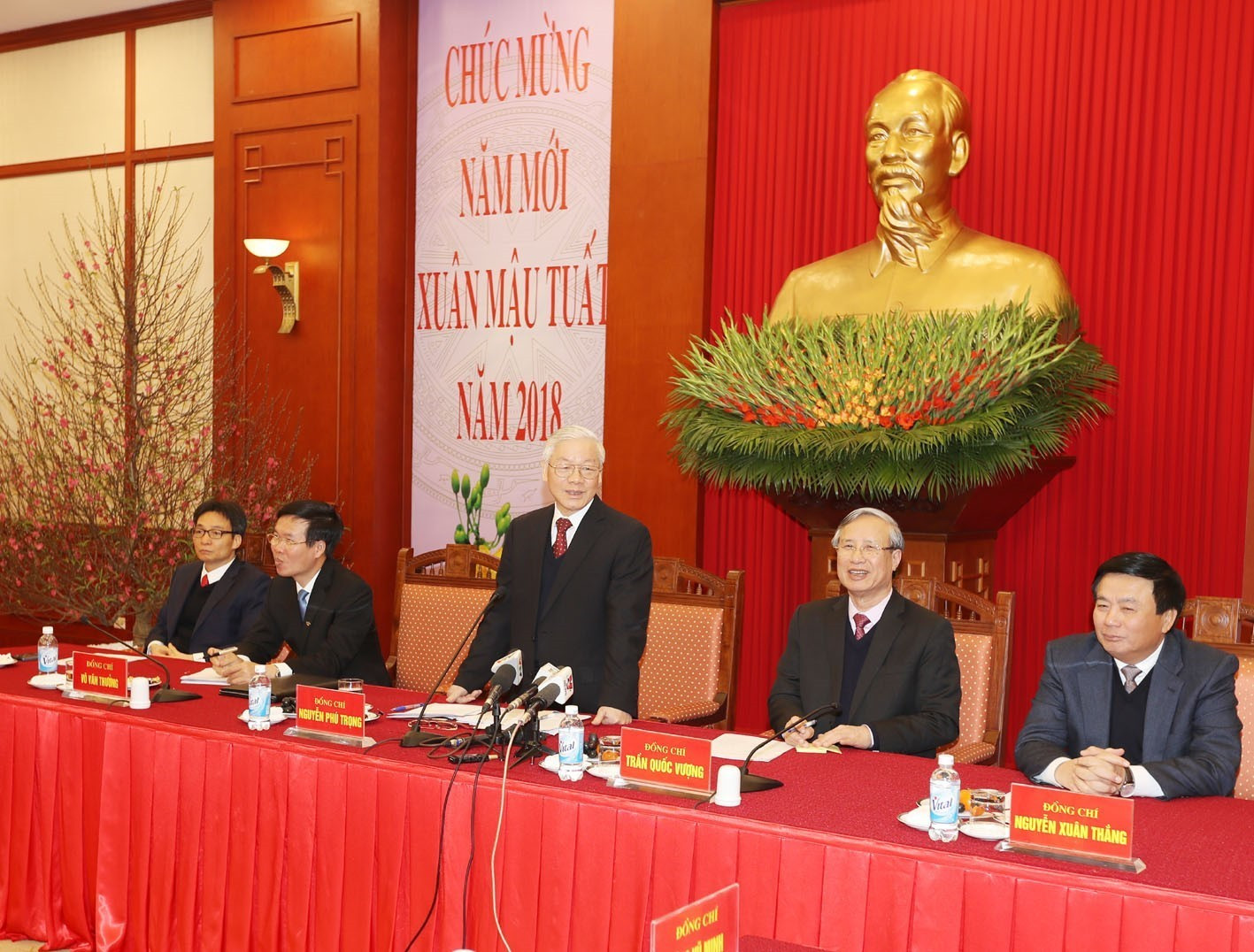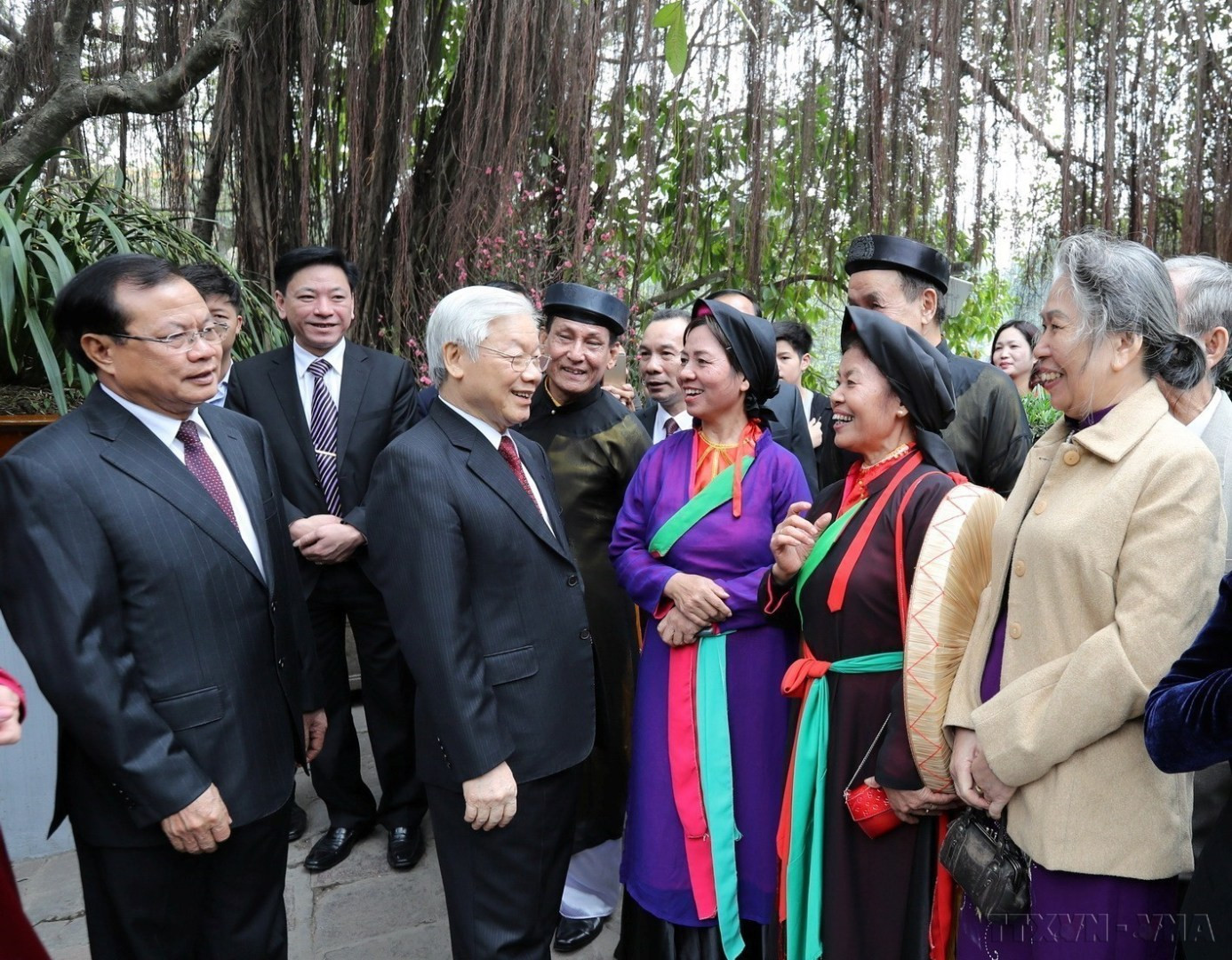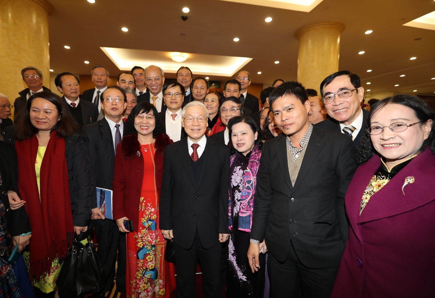 On the morning of February 7, 2018, General Secretary Nguyen Phu Trong, along with other Party and State leaders, attended a gathering with intellectuals and artists in celebration of the Lunar New Year 2018 (Photo: VNA)