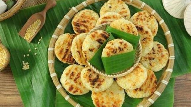 After steaming it is ground up and mixed with coconut juice and coconut threads plus several tablespoons of sugar, then put in a frame. The cake is as big as a child’s palm. After framing, the cake is then grilled.