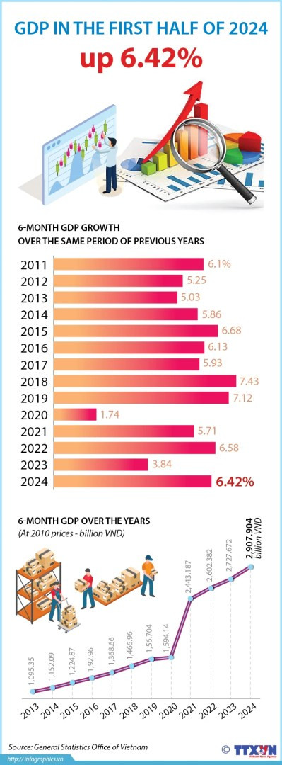The impressive growth in the Gross Regional Domestic Product (GRDP) of many localities, with some witnessing increases of over 14%, has contributed to the country’s 6.42-percent GDP expansion in the first half of 2024, slightly lower than the 6.58-percent growth level in the same period of 2022.