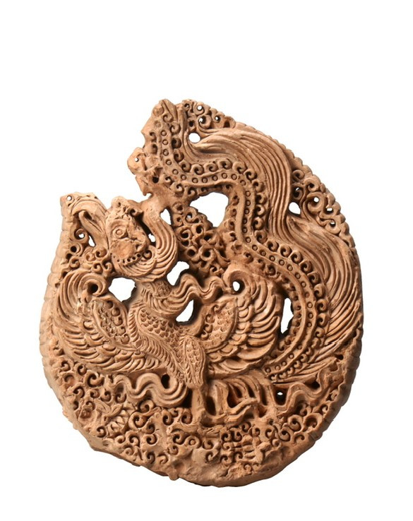 | Terracotta roof tile preserved in the Thang Long Imperial Citadel, depicting the symbol of the dragon decorated by the bodhi leaf. |